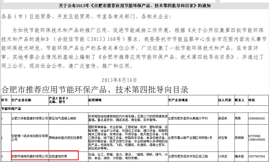 環瑞作為合肥經濟科學建設道路上的重要成員,一直朝著“科技環瑞,電熱成就世界”的偉大藍圖邁進,其具有低電阻過渡層的自限溫電伴熱產品先后獲得省,市關于科技成果的榮譽有:合肥市科學技術獎,安徽省高新技術產品,合肥重點名牌產品。國家7項專利證書。其環保節能的特點已經獲得政府、行業協會,及市場的認可。目前,環瑞公司已通過了合肥市推薦應用節能環保產品、技術目錄的公示,獲得了環保節能產品稱號,以下為合肥經濟和貿易信息化委員會網站的公示內容: